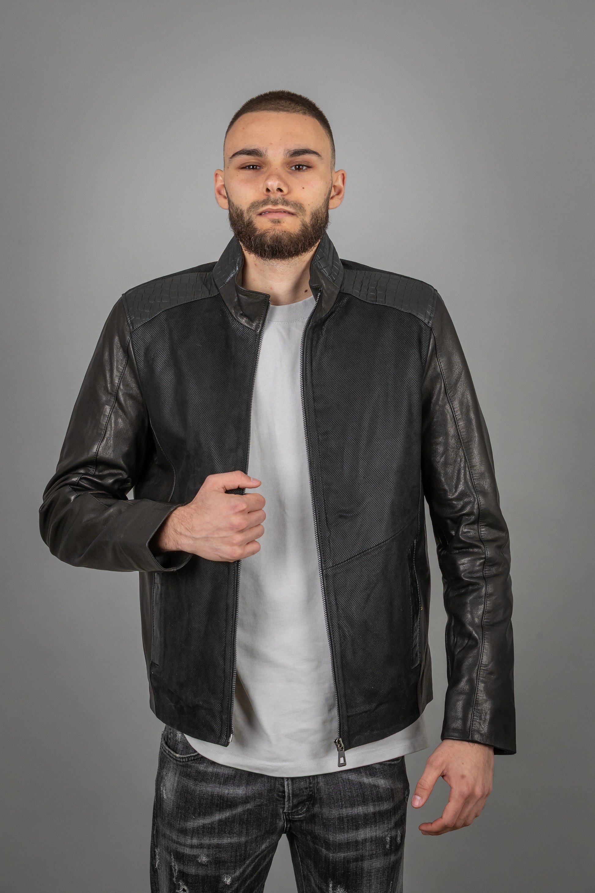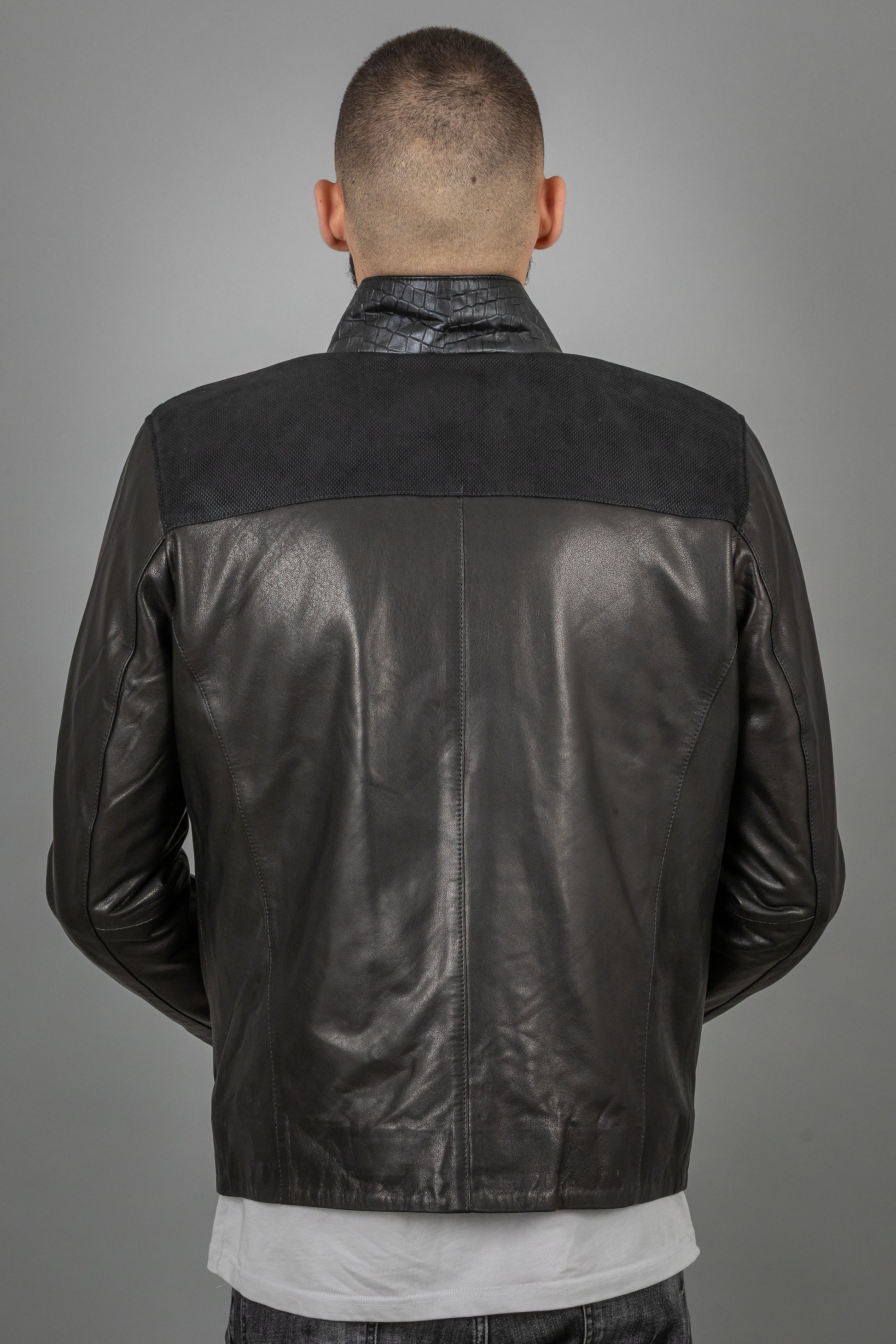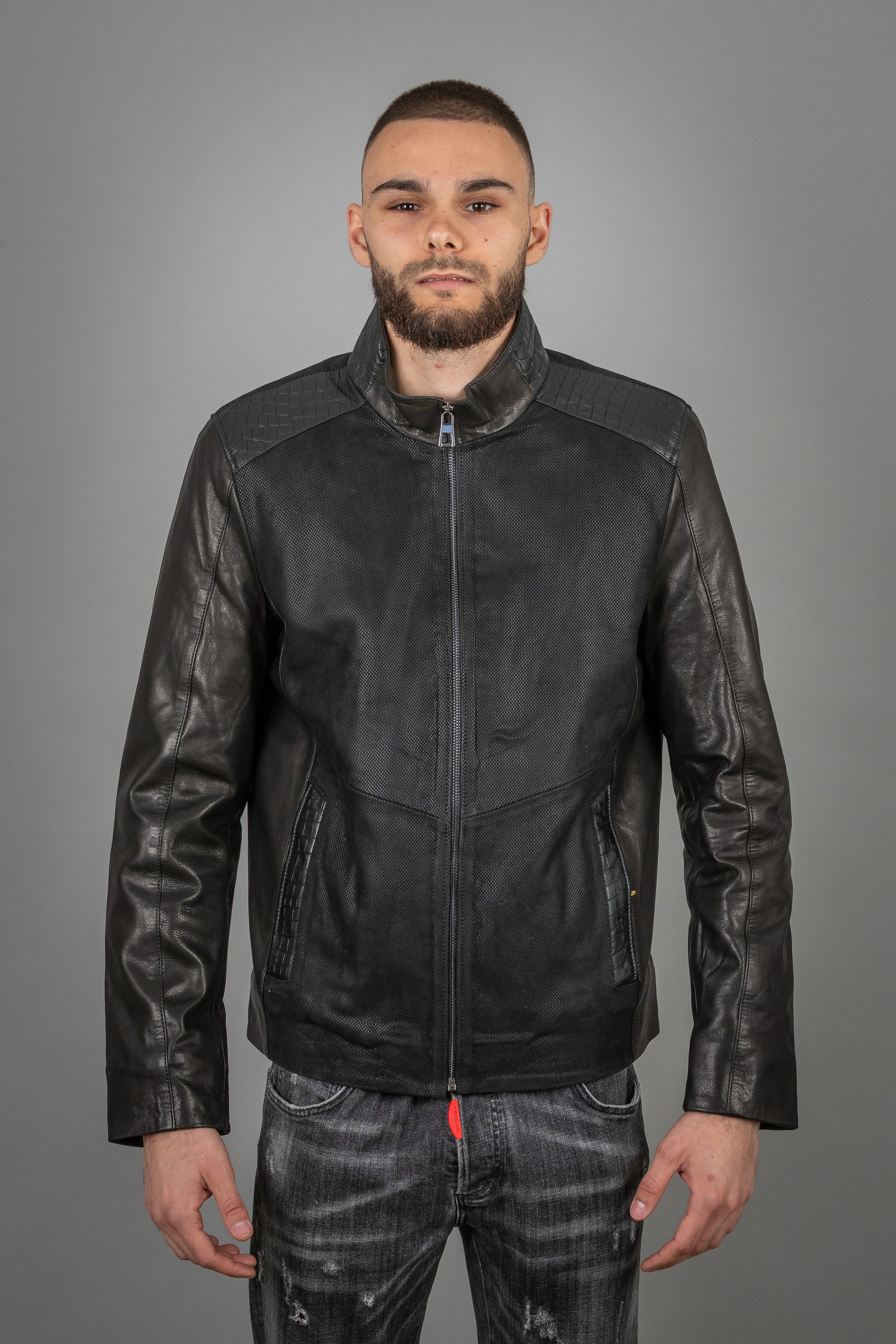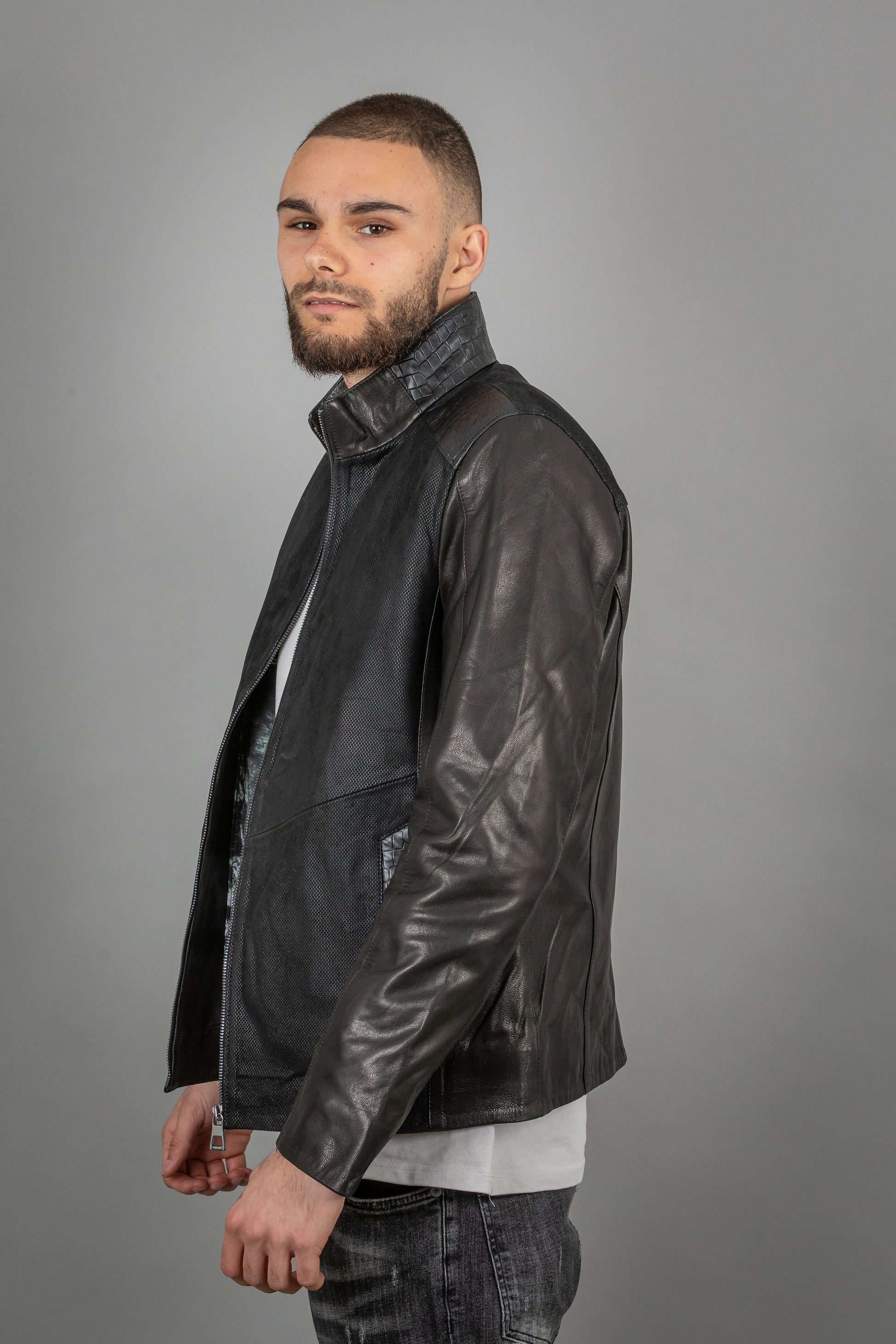 Whether paired with denim for a rugged edge or layered over a turtleneck for a refined touch, this pressed and upper calf leather jacket is a true statement of modern luxury.